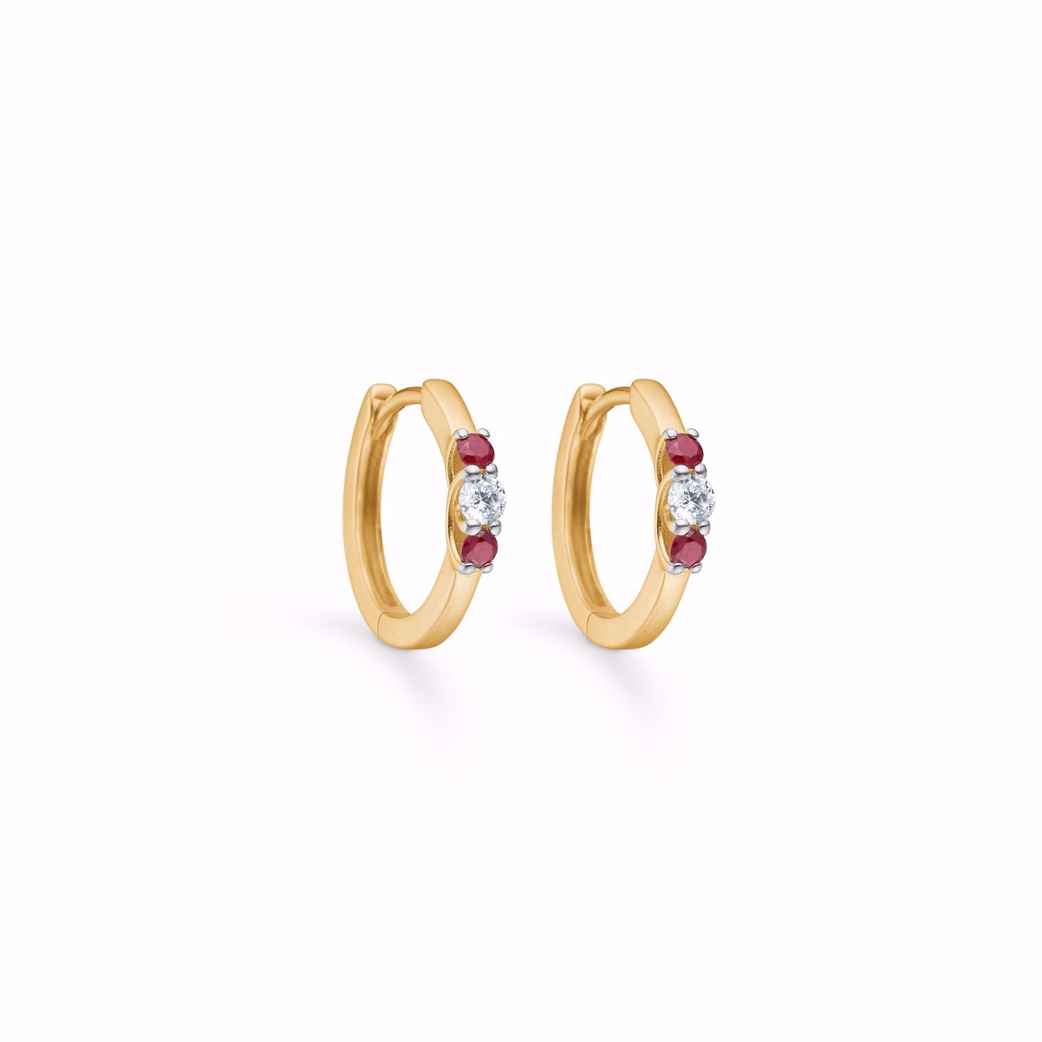 Smukke og tidløse creoler øreringe i 8 karat guld med 2 smukke rubiner & én klar zirkonia sten