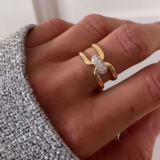 Guldringen fra Guld & Sølv Design er designet i et elegant og moderne design. Den er lavet af 8 karat guld med en stilfuld, åben konstruktion, hvor to buede guldbånd mødes i midten. Midtpunktet af ringen er en smukt dekoreret sektion med funklende zirkonia-sten, der tilføjer et eksklusivt og glamourøst udtryk. Den åbne og symmetriske udformning giver ringen et luftigt og sofistikeret look, perfekt til både hverdag og festlige lejligheder.