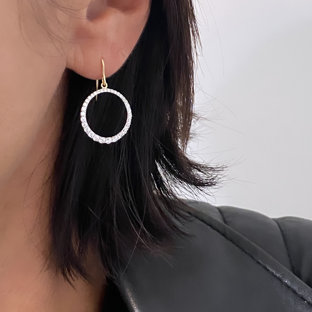 Elegante & stilrene cirkel øreringe med krog i 8 karat guld med små klare zirkonia sten. De små zirkonia sten er størst i nederste del af cirklen og bliver mindre på vej rundt op til toppen.