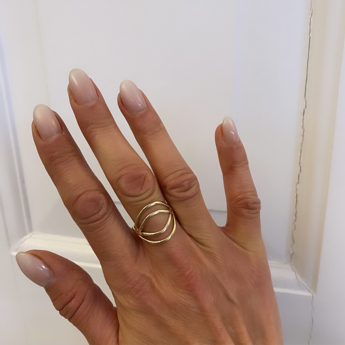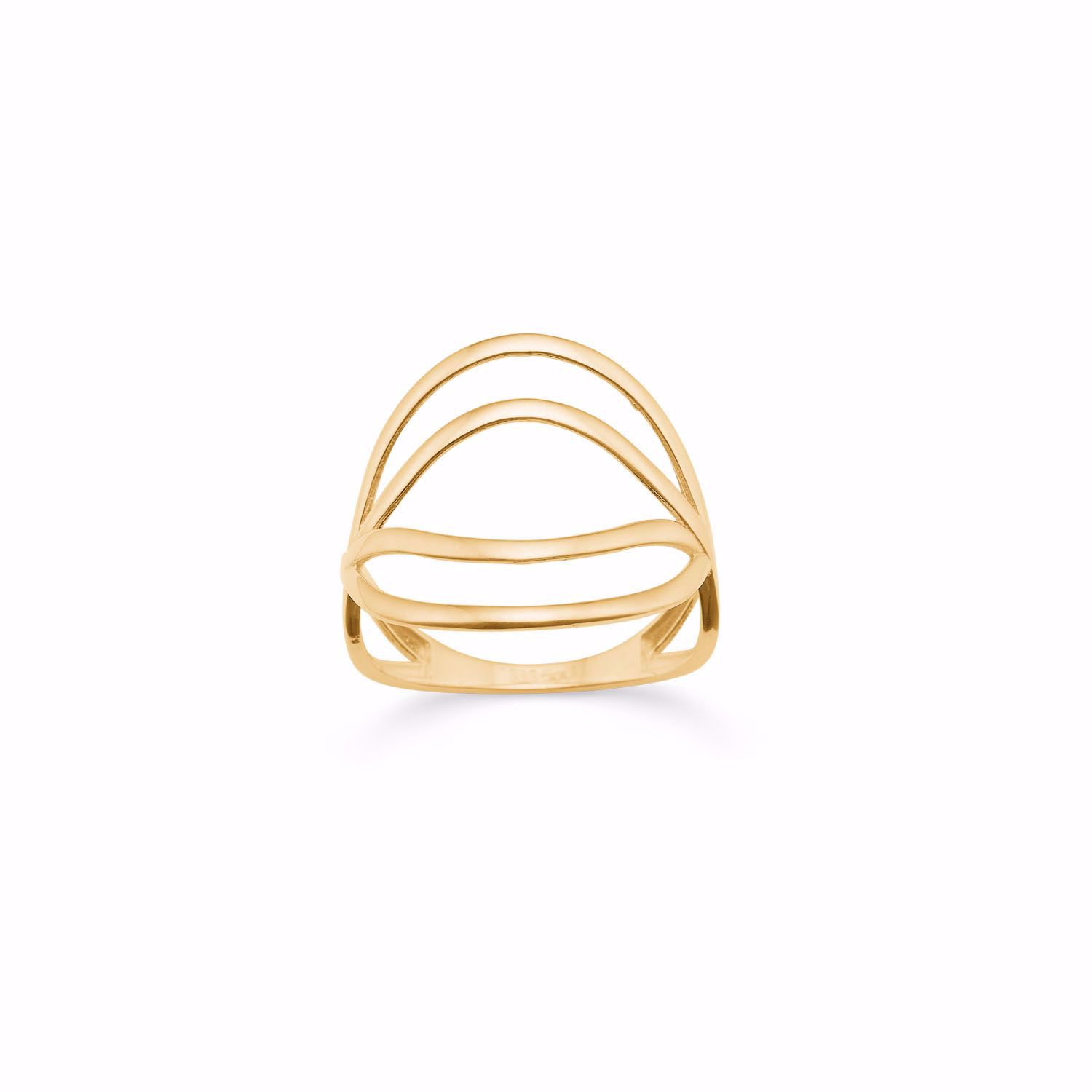 Guldringen fra Guld & Sølv Design er en elegant og moderne designring udført i 8 karat guld. Ringen kendetegnes ved sit åbne design, hvor fine buede tråde krydser hinanden på toppen og skaber en luftig og sofistikeret struktur. De glatte linjer og den polerede overflade giver et tidløst og stilrent udtryk.
