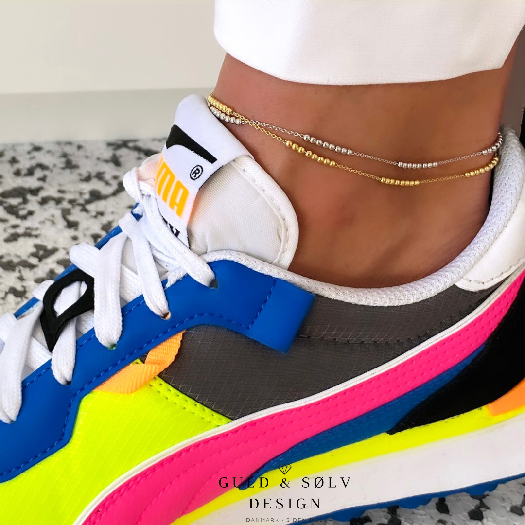 Hvis du er til lidt mere iøjenfaldende ankelkæder kan du vælge at købe en ankelkæde som har charms, vores populære dobbelt ankelkæde, eller med farvede perler osv.