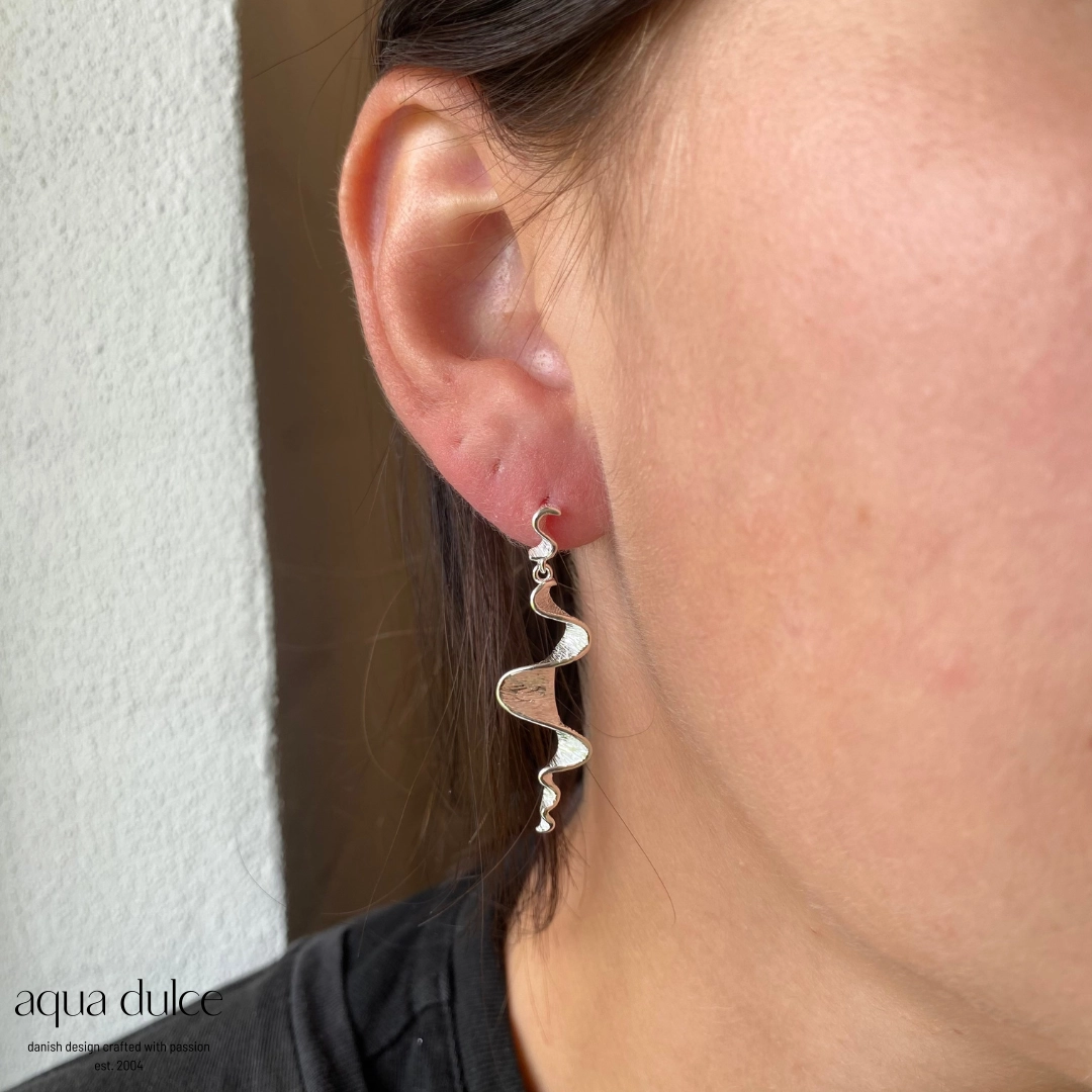 Aqua Dulce Rhumba lange sølv øreringe er fremstillet i et lækkert buet mønster