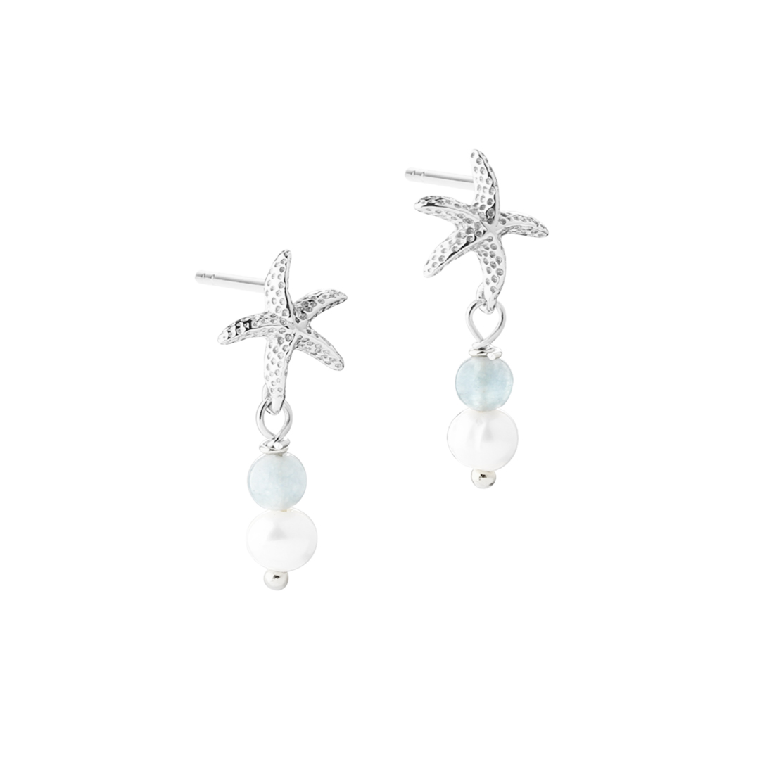 De fineste søstjerne øreringe fra Aqua Dulce STELLA kollektion. I STELLA BLUE øreringene sidder en naturtro søstjerne med en blå akvamarin og hvid ferskvandsperle