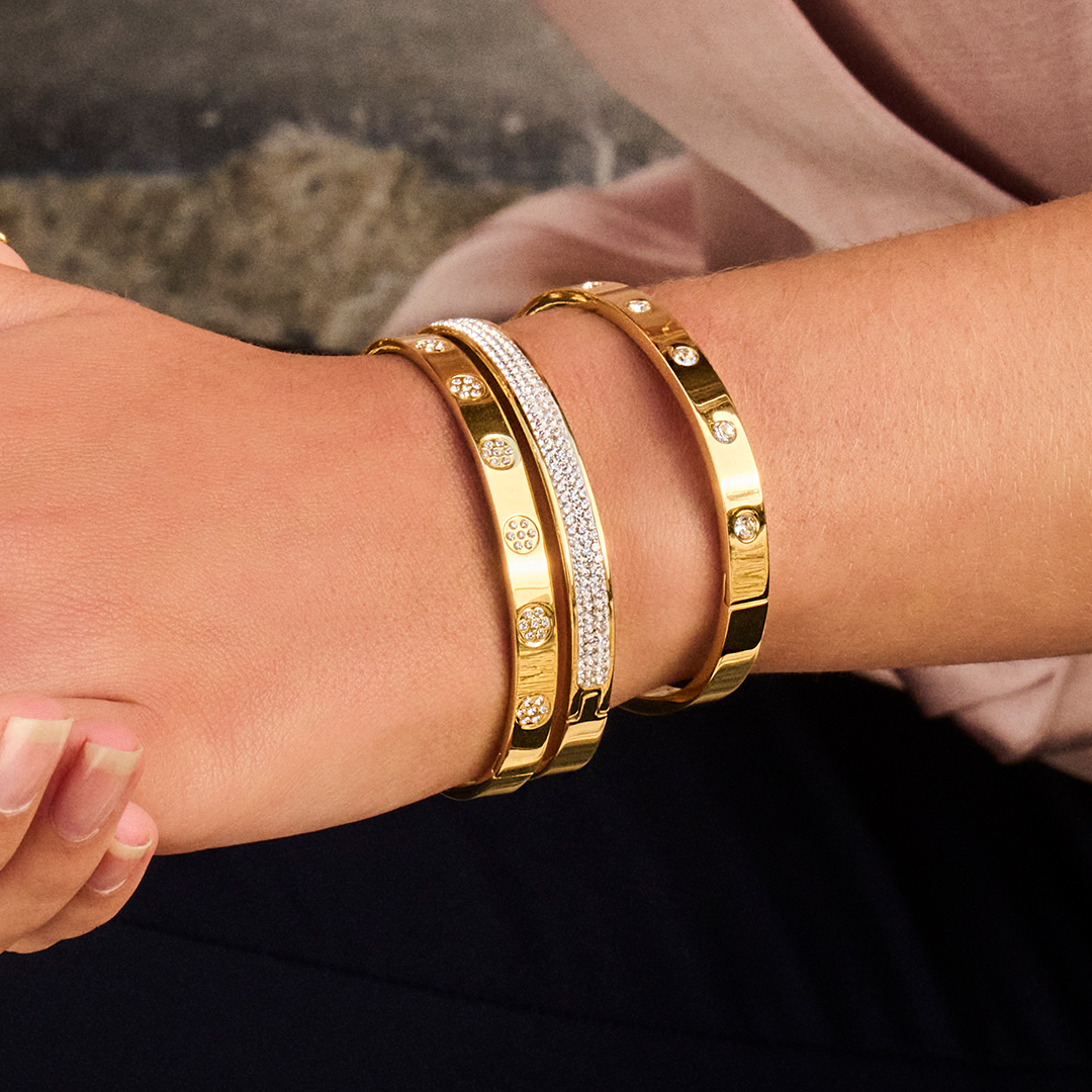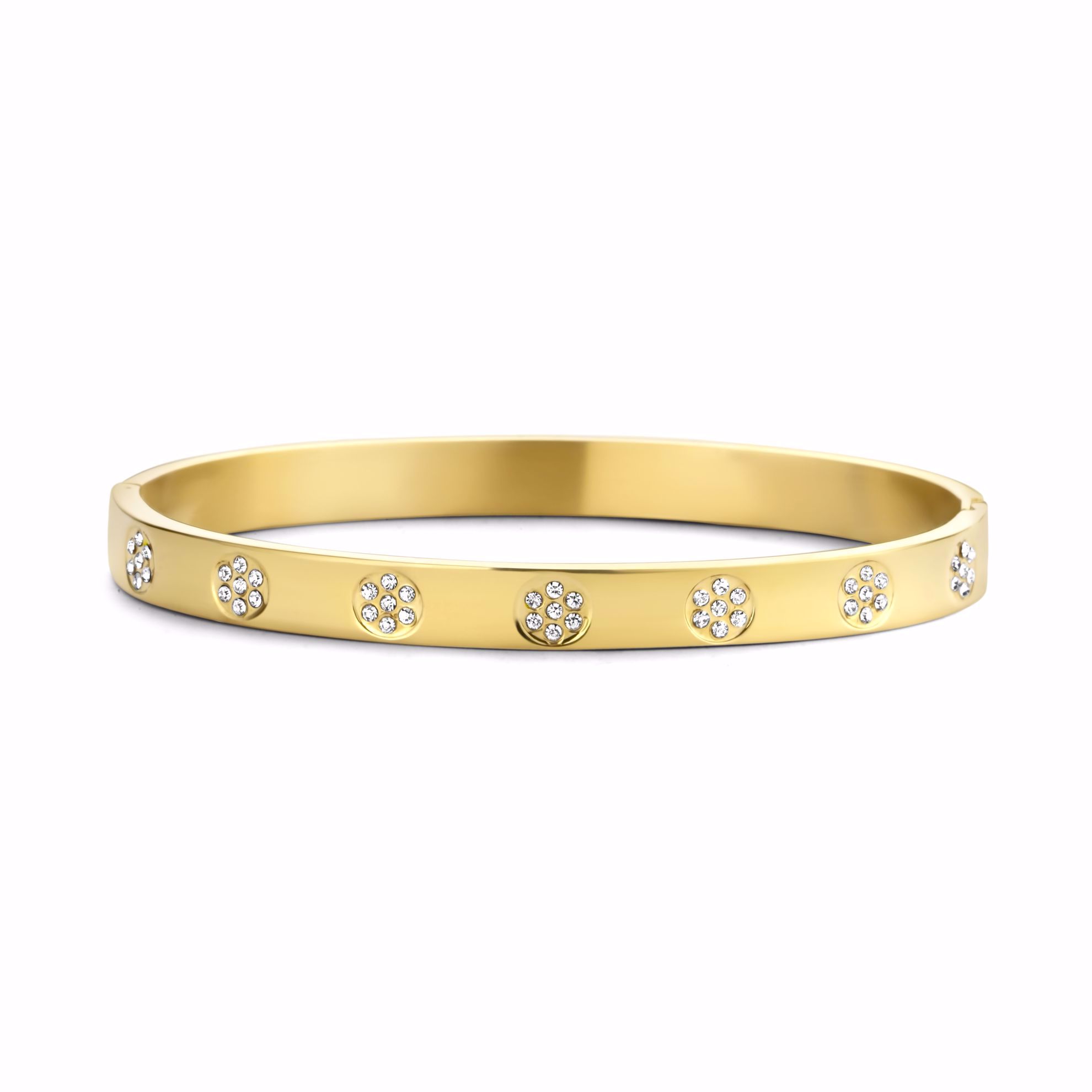 Lækker armring i guldfarvet rustfrit stål med klare zirkonia sten.