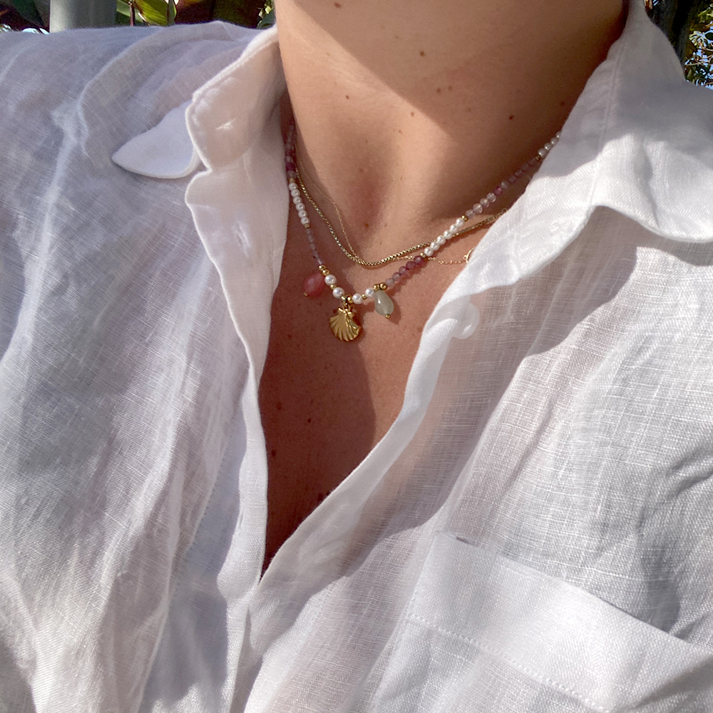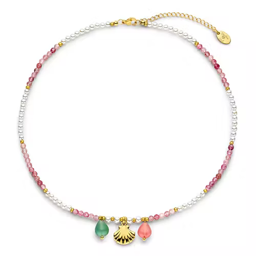 I sten halskæden sidder 3 stk vedhæng - et rosa vedhæng - et lys grønt vedhæng og i midten en muslingeskal i guldfarvet stål
