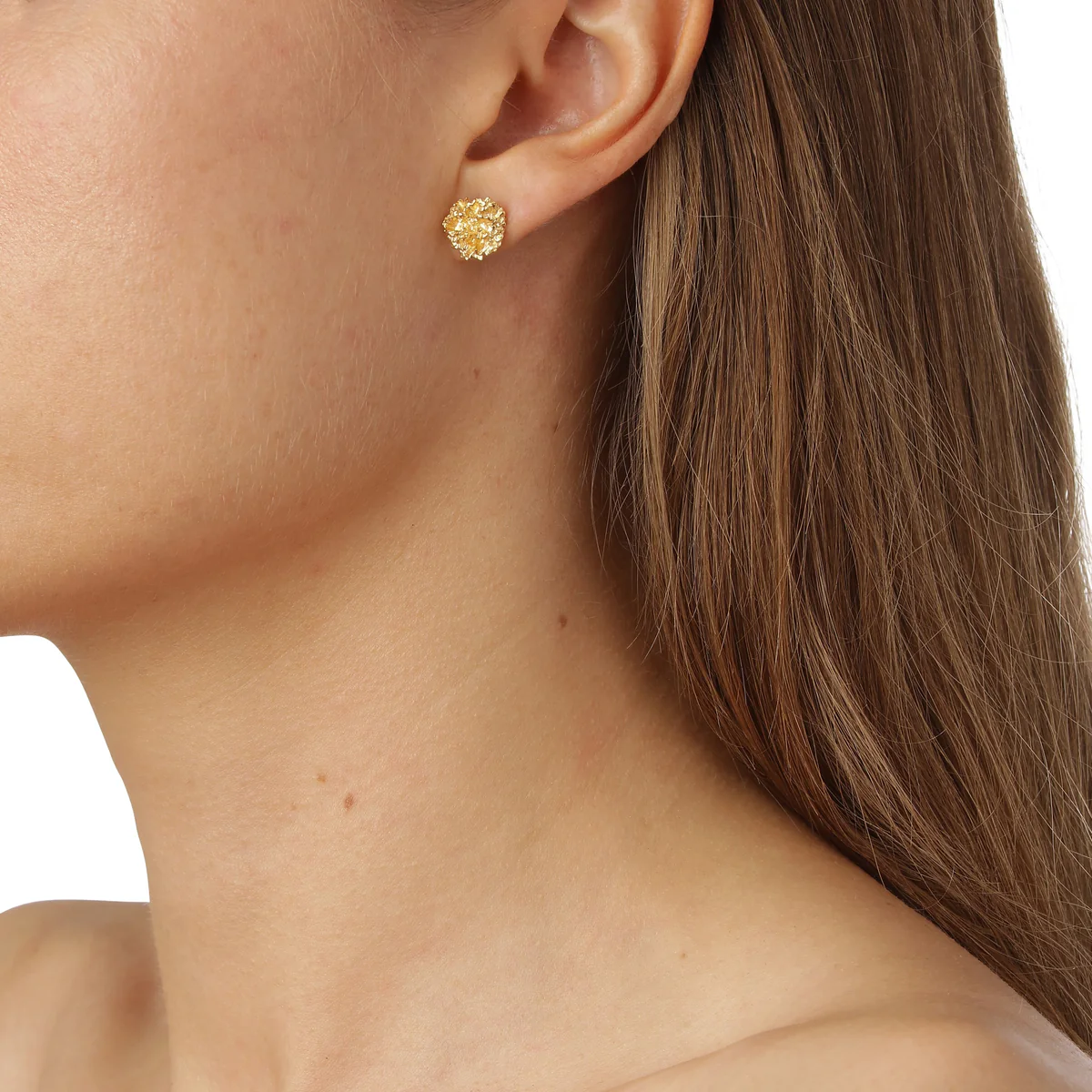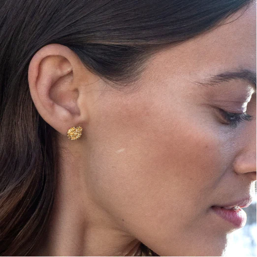 Ørestikkerne er lavet i 925 sterlingsølv og belagt med 22 karat guld, hvilket giver et varmt og elegant udtryk. Et unikt smykke med et naturligt og tidløst design – perfekt til dig, der elsker naturinspirerede accessories.