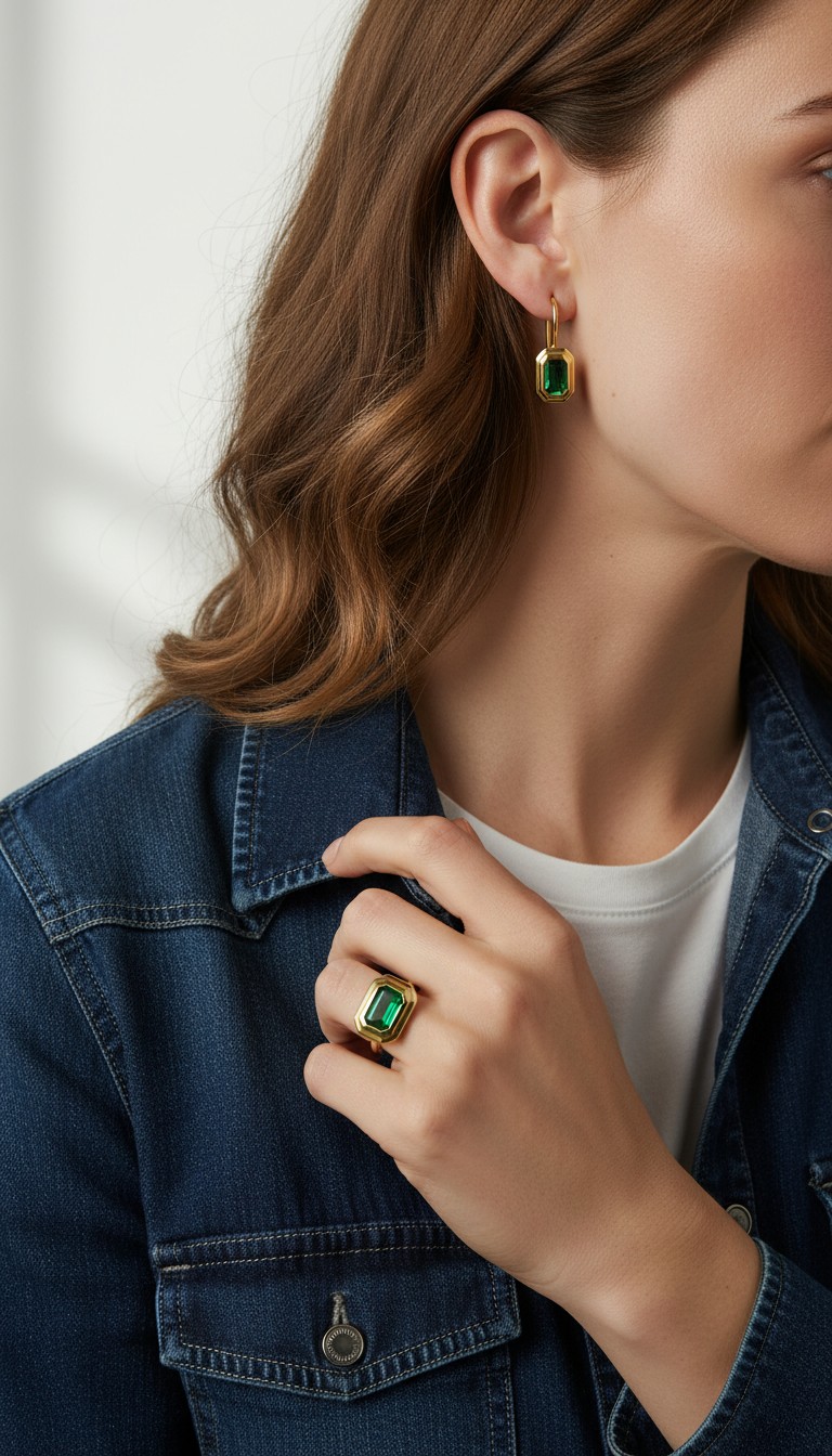 Disse øreringe fra Seville Jewelry er lavet i forgyldt 925 sterling sølv og sat med en grøn zirkonia i emerald‑cut facon. Den rektangulære sten har skarpe linjer og et markant look, der giver smykket en mere rå kant end de klassiske dråbe‑ eller runde former. Øreringene måler 20 mm og har en slank, buet krog, der giver dem et enkelt men karakterfuldt udtryk.