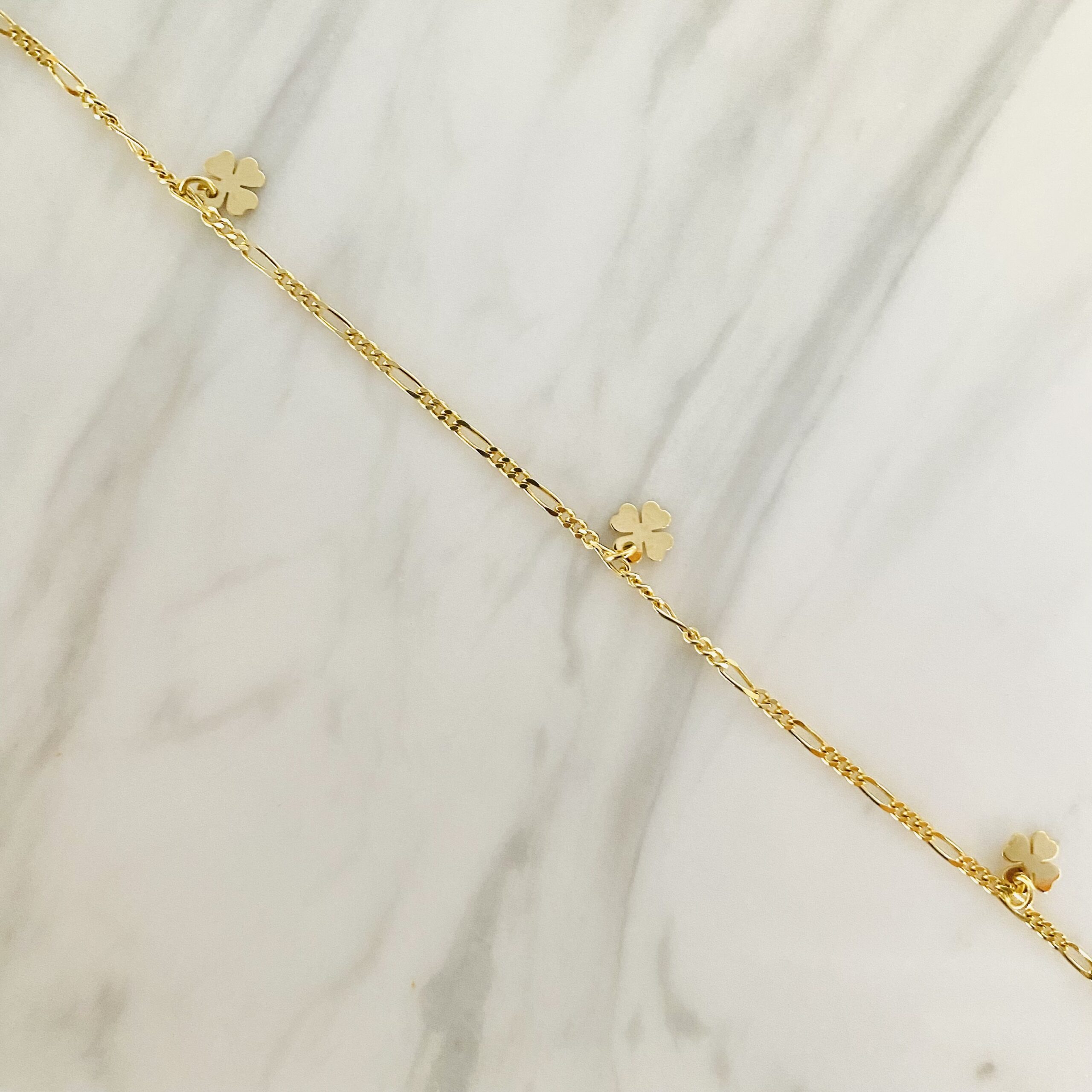 Super flot ankelkæde i forgyldt sterling sølv med figaro mønster og 3 stk firkløver vedhæng.