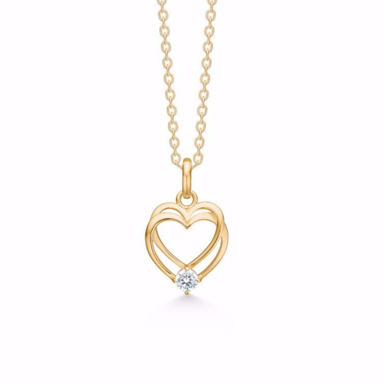 Smukt hjerte vedhæng i 8 karat guld med en lille klar zirkonia sten. Hjerte vedhænget består af 2 hjerter som er flettet ind i hinanden. God kærlighedsgave. Den smukke hjerte halskæde er fra Guld & Sølv Design