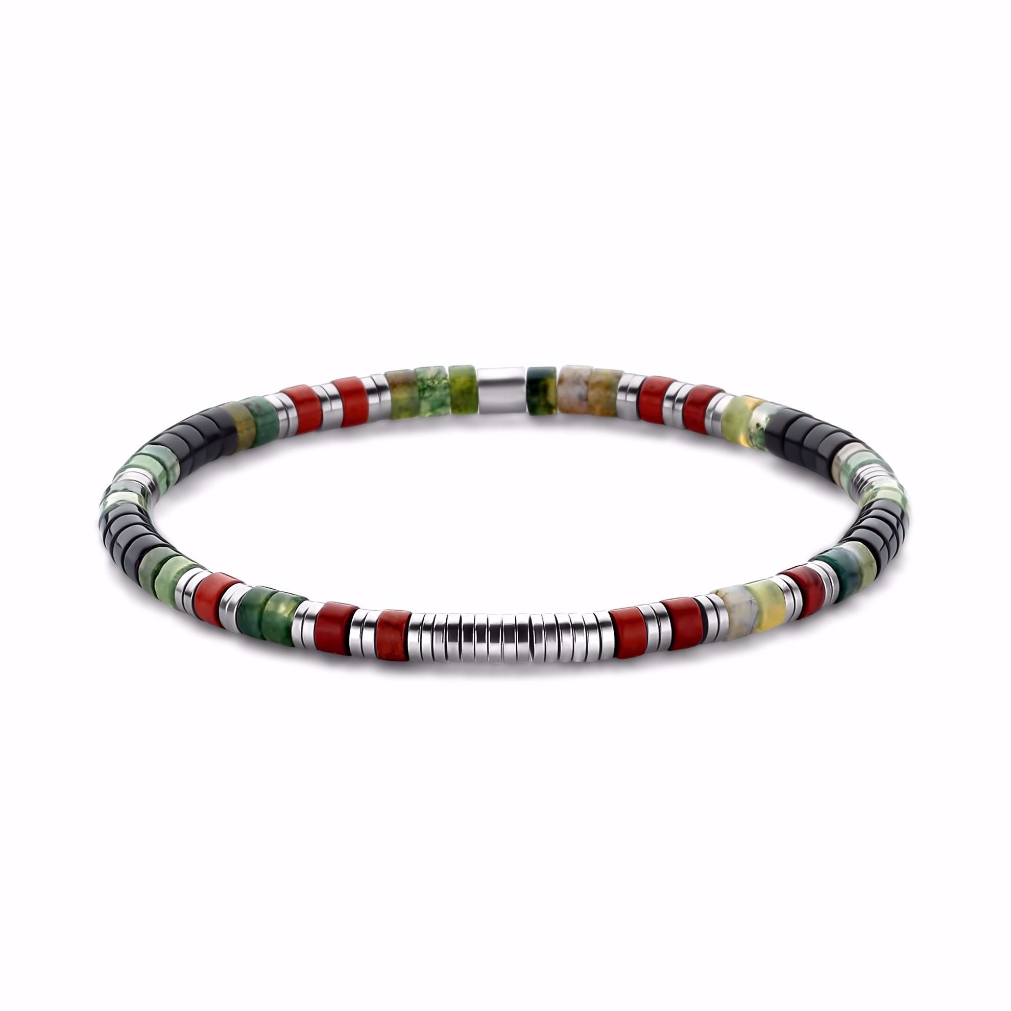 Dette Frank1967 armbånd er fremstillet af stål af høj kvalitet og er prydet med flade sten af sort agat, mos agat og røde sten (4x2 mm) for et moderne, naturligt touch. Brug det alene eller miks og match med andre armbånd for at skabe en karakteristisk stil, der er helt din egen.