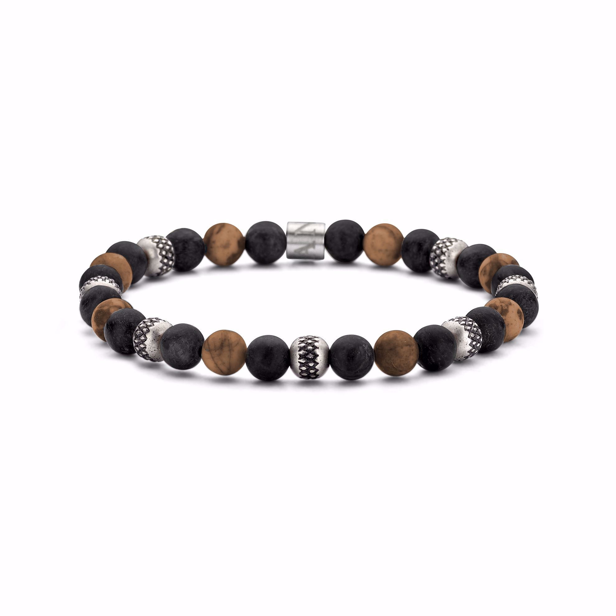 Herrearmbånd med 6 mm agat- og tigerøje-sten samt metalperler. Elastisk pasform og et råt, maskulint look.