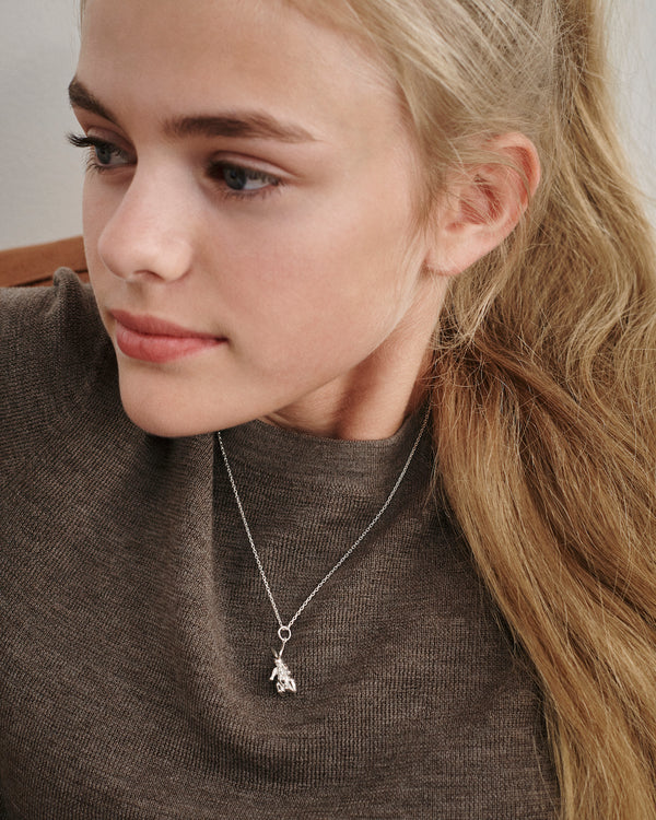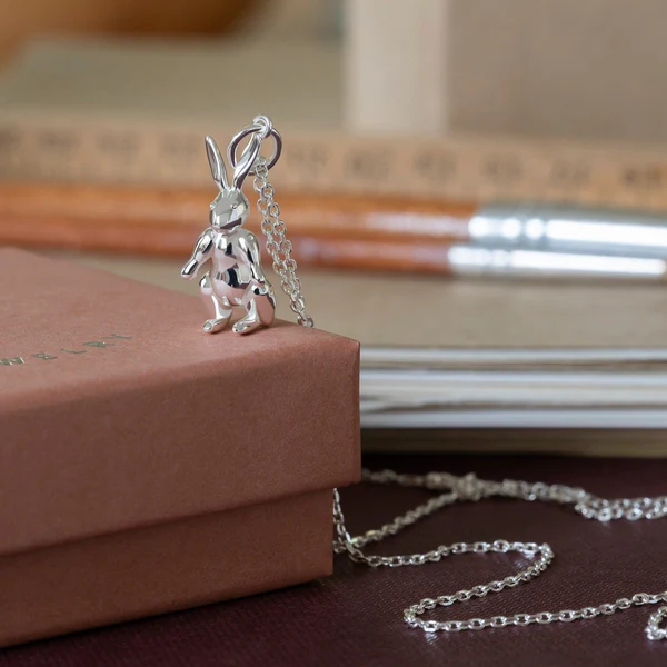 Kaninhænget fra Kay Bojesen jewelry er fremstillet i 925 sterling sølv. Hvert vedhæng er skabt med omhu og under strenge kvalitetskrav for at sikre både holdbarhed og en perfekt udførelse. Designet er tro mod Bojesens ikoniske kanin, hvilket gør smykket til en tidløs klassiker i eksklusive materialer.