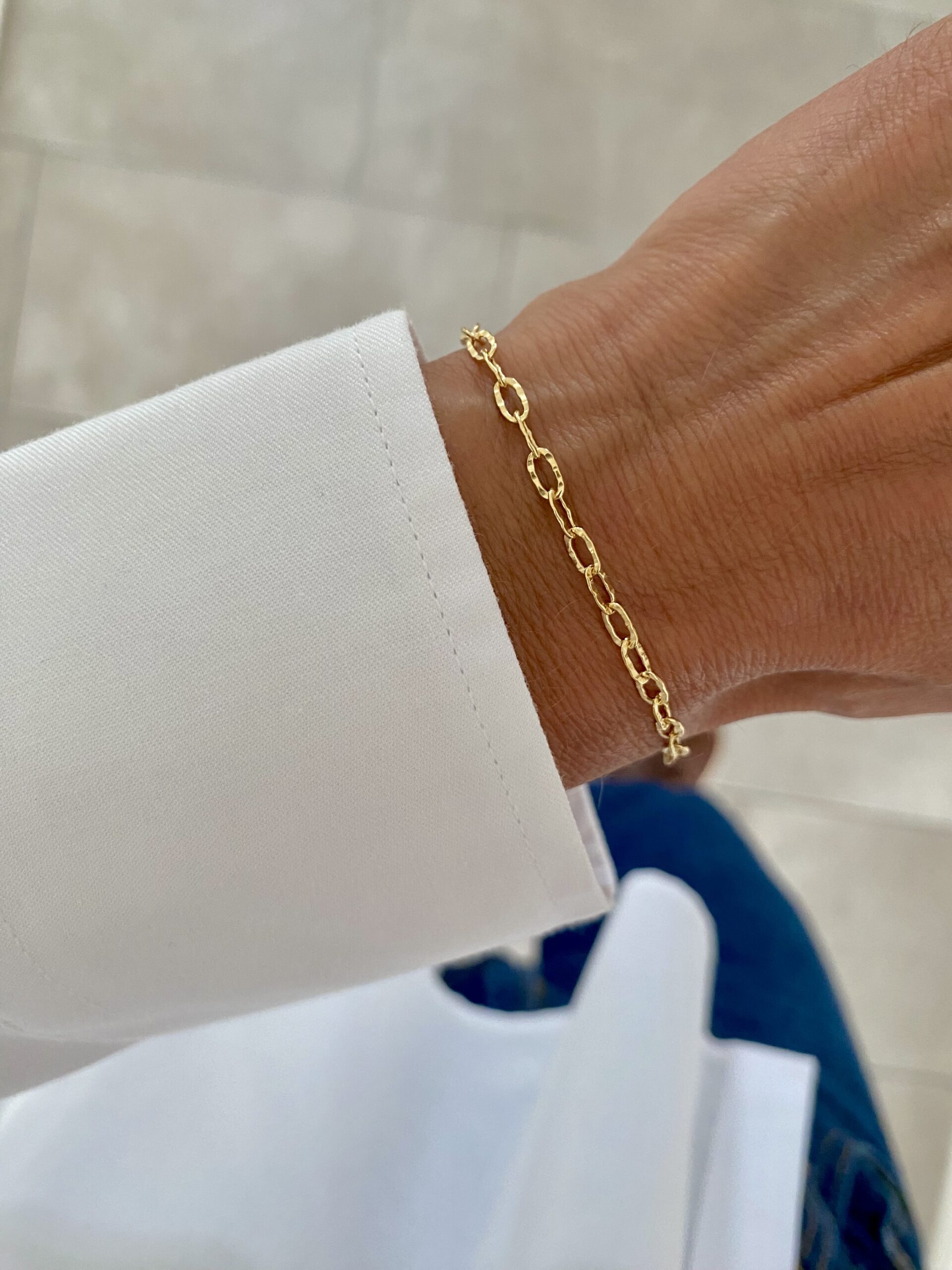 Norma armbåndet fra Seville Jewelry er et stilrent kædearmbånd i forgyldt 925 sterling sølv. Det består af fine ovale led med en rustik overflade og har en justerbar lukning, så du nemt kan tilpasse det til dit håndled. Designet er enkelt og tidløst – perfekt til dig, der gerne vil have et smykke, der passer til alt.
