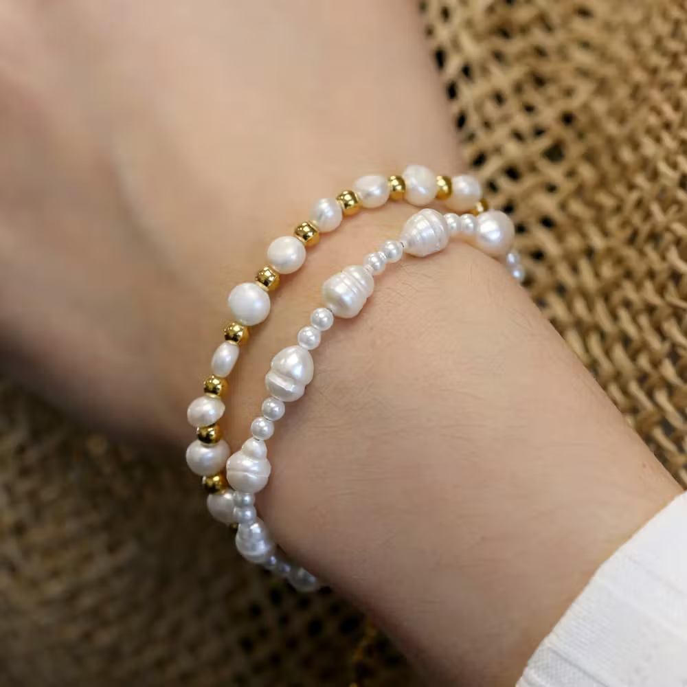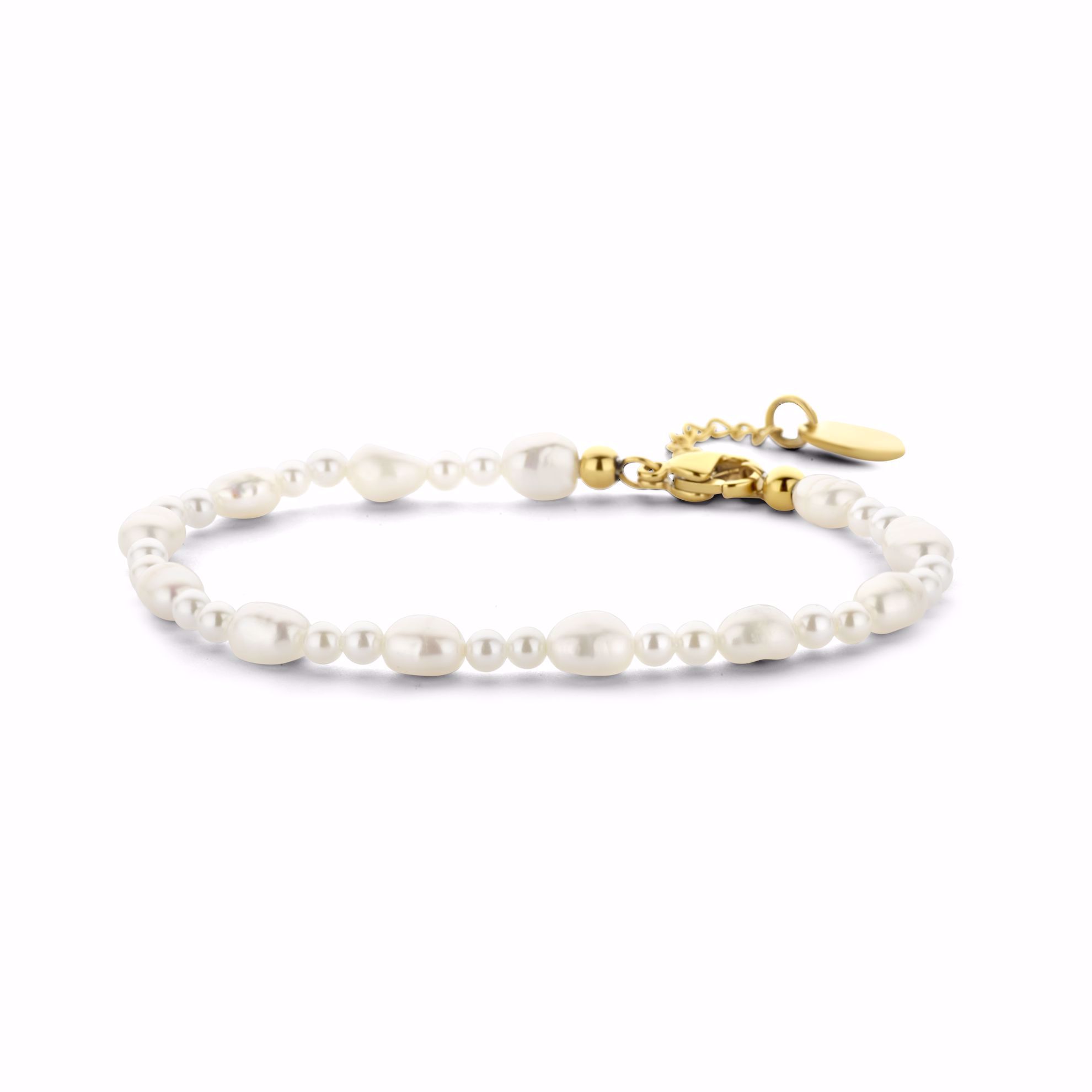 Tilføj et nyt perlearmbånd til din smykkesamling! Armbåndet er i guldfarvet stål med perler i forskellige størrelser og former.