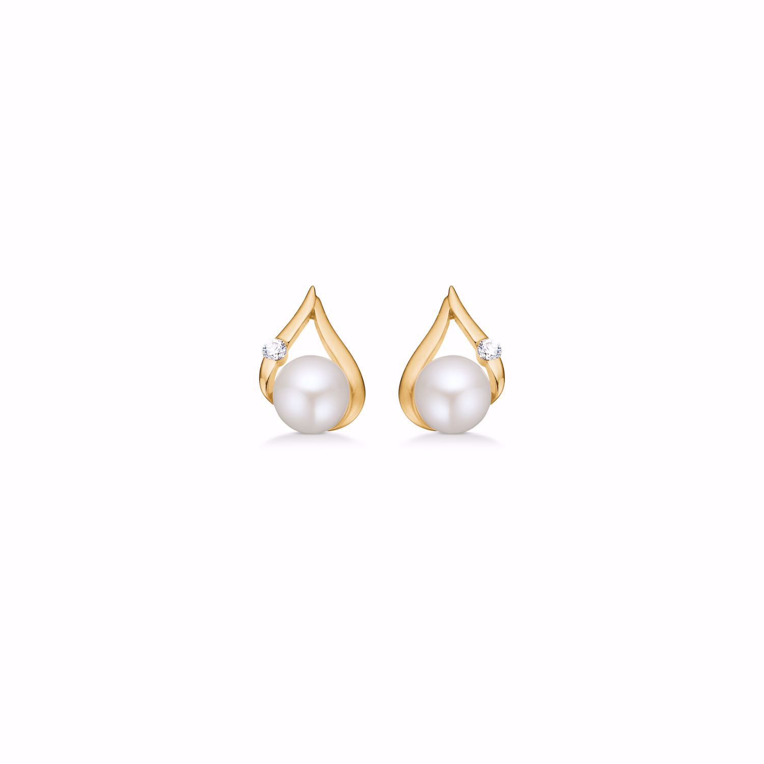 Smukke ørestikker i 8 karat guld med klassisk hvid ferskvandsperle & en lille klar zirkonia sten.
