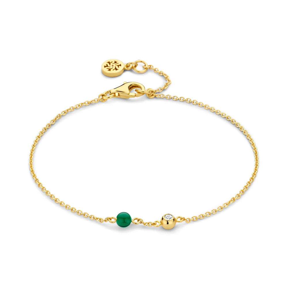 Lucky armbånd i 18 kt forgyldt, genanvendt sterlingsølv med grøn sen og en lille kugle isat en klar zirkonia.