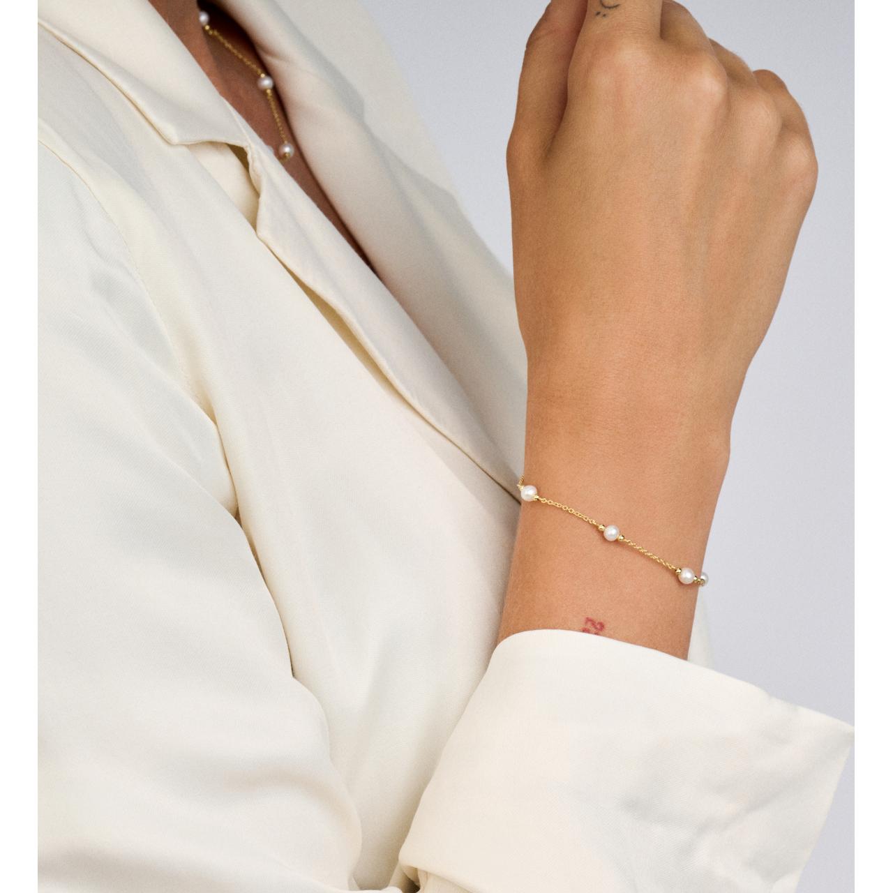 Armbåndet hedder ATHENA og er i forgyldt 925 sterling sølv med hvide ferskvandsperler.