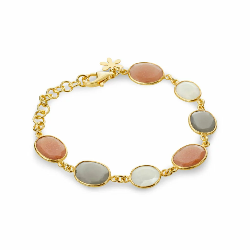 Lækkert Susanne Friis Bjørner armbånd i forgyldt sølv med månesten i farverne hvid, fersken & grå